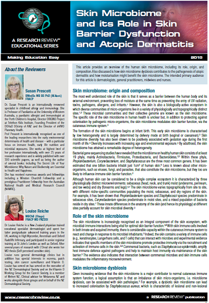 This article provides an overview of the human skin microbiome, including its role, origin, and composition. Also discussed is how skin microbiome dysbiosis contributes to the pathogenesis of atopic dermatitis and how moisturisation might benefit the skin microbiome. The intended primary audience for this article is dermatologists, general practitioners, midwives and nurses.