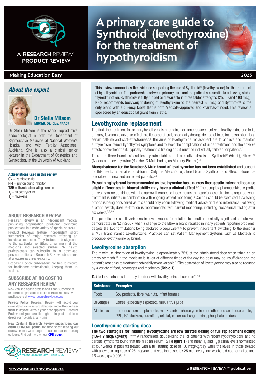 This review summarises the evidence supporting the use of Synthroid® (levothyroxine) for the treatment of hypothyroidism. The partnership between primary care and the patient is essential to achieving stable thyroid function. Synthroid® is fully funded and available in three tablet strengths (25, 50 and 100 mcg). NICE recommends bodyweight dosing of levothyroxine to the nearest 25 mcg and Synthroid® is the only brand with a 25-mcg tablet that is both Medsafe-approved and Pharmac-funded. This review is sponsored by an educational grant from Viatris.