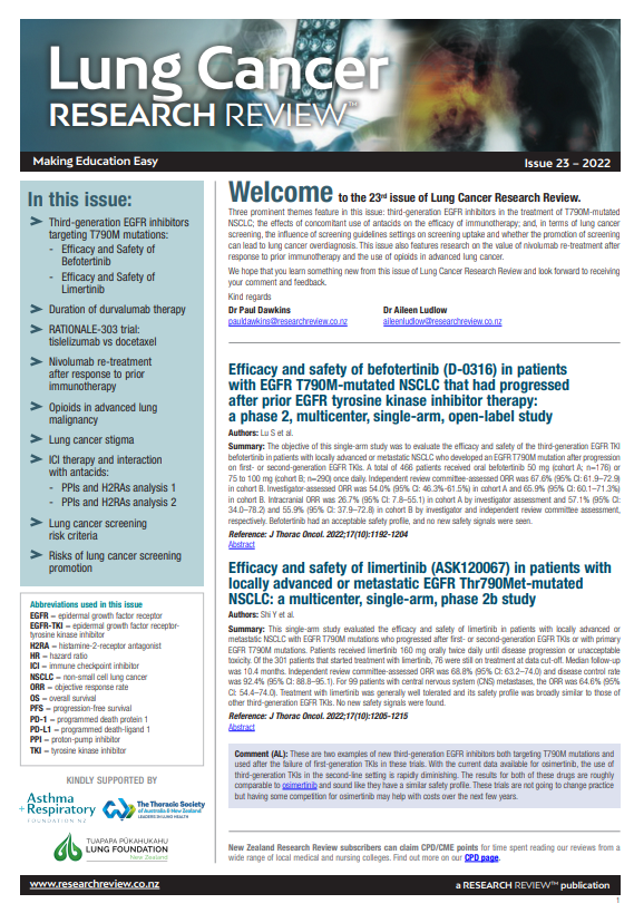 This Review features key medical articles from global oncology journals with commentary from Drs Paul Dawkins and Aileen Ludlow.  This review will bring you some of the most significant published research on lung cancer from around the world. Each issue contains an independent selection of papers chosen by medical specialists discussing what is relevant and how it can potentially influence current practice.