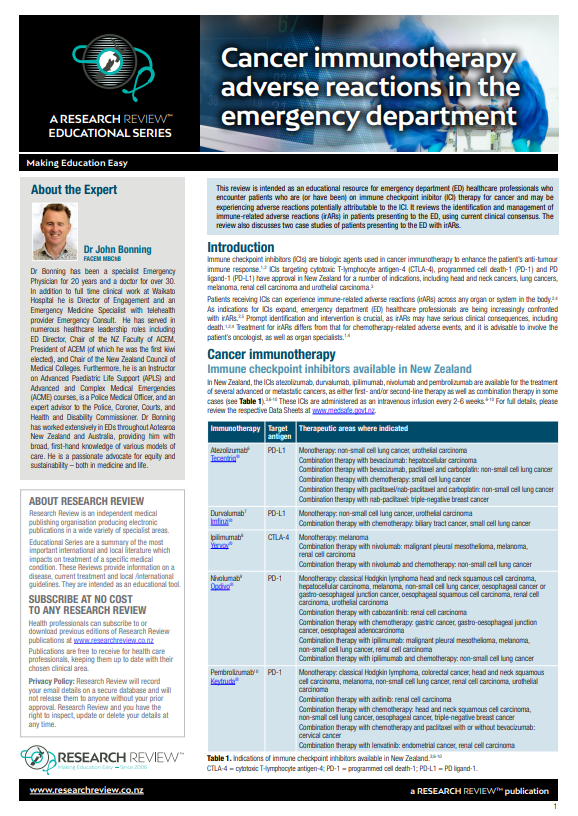 This review is intended as an educational resource for emergency department (ED) healthcare professionals who encounter patients who are (or have been) on immune checkpoint inhibitor (ICI) therapy for cancer and may be experiencing adverse reactions potentially attributable to the ICI. It reviews the identification and management of immune-related adverse reactions (irARs) in patients presenting to the ED, using current clinical consensus. The review also discusses two case studies of patients presenting to the ED with irARs.