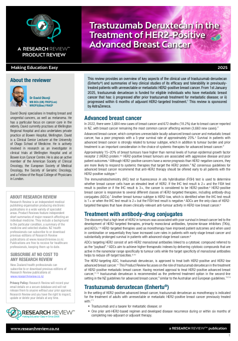 This review provides an overview of key aspects of the clinical use of trastuzumab deruxtecan (Enhertu®) and summaries of key clinical studies of its efficacy and tolerability in previously treated patients with unresectable or metastatic HER2-positive breast cancer. From 1st January 2025, trastuzumab deruxtecan is funded for eligible individuals who have metastatic breast cancer that has: i) progressed after prior trastuzumab treatment for metastatic disease; or ii) progressed within 6 months of adjuvant HER2-targeted treatment. This review is sponsored by AstraZeneca.