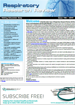 This Review features key medical articles from global respiratory journals with commentary from Professor Lutz Beckert. The Review covers topics such as COPD, pulmonary embolism, venous thromboembolism, emphysema, chronic bronchitis, cystic fibrosis, non-small cell lung cancer, obstructive sleep apnoea, corticosteroids and nebulisers.