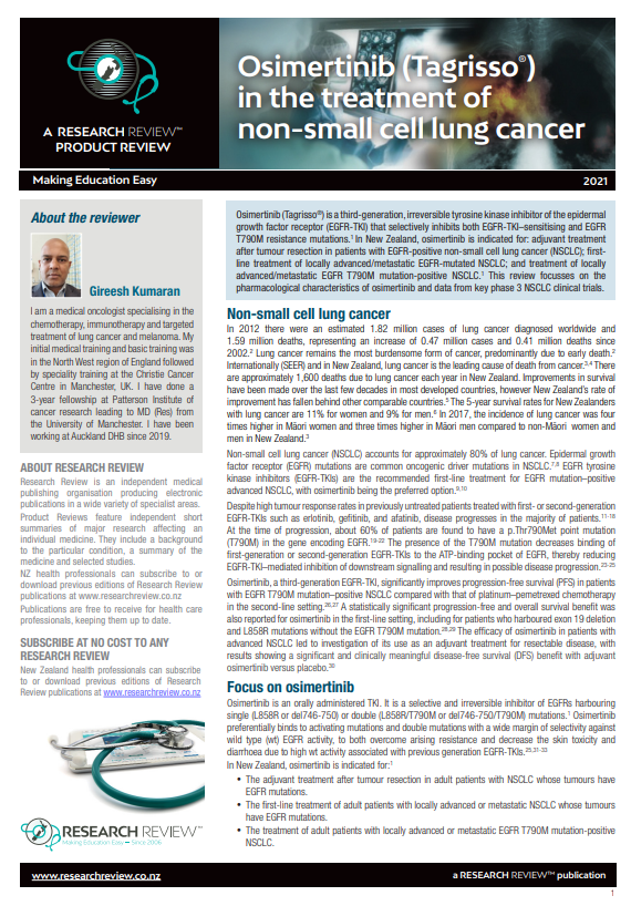 Osimertinib (Tagrisso®) is a third-generation, irreversible tyrosine kinase inhibitor of the epidermal growth factor receptor (EGFR-TKI) that selectively inhibits both EGFR-TKI–sensitising and EGFR T790M resistance mutations.1 In New Zealand, osimertinib is indicated for: adjuvant treatment after tumour resection in patients with EGFR-positive non-small cell lung cancer (NSCLC); firstline treatment of locally advanced/metastatic EGFR-mutated NSCLC; and treatment of locally advanced/metastatic EGFR T790M mutation-positive NSCLC.1 This review focusses on the pharmacological characteristics of osimertinib and data from key phase 3 NSCLC clinical trials.