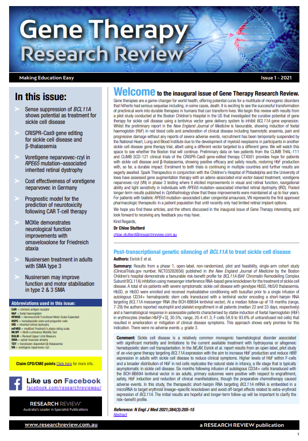 This Review features key medical articles from global journals with commentary from Dr Heidi Peters. The Review covers topics such as sickle cell disease, inherited retinal dystrophy, CAR T-cell therapy, spinal muscular atrophy and other monogenic disorders.