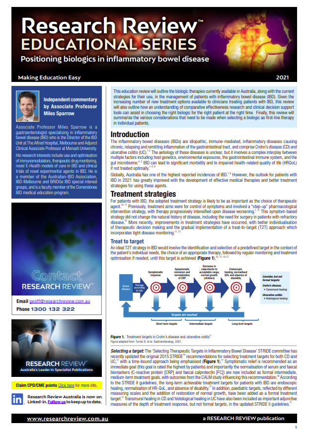 The review includes guiding commentary from Associate Professor Miles Sparrow, a gastroenterologist specialising in IBD who is the Director of the IBD Unit at The Alfred Hospital, Melbourne and Adjunct Clinical Associate Professor at Monash University.