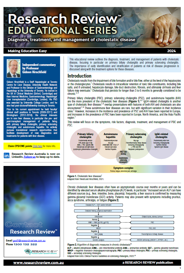 The review covers primary biliary cholangitis, primary sclerosing cholangitis, and a series of studies exploring future directions and clinical trials. It also includes guiding commentary from Professor Gideon Hirschfield, Staff Hepatologist at Toronto Centre for Liver Disease, University Health Network.