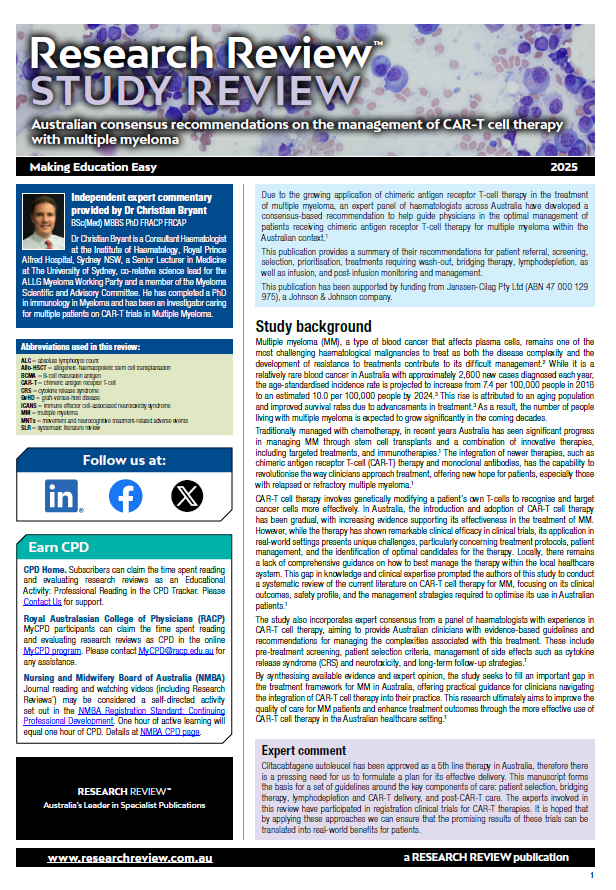 Due to the growing application of CAR-T cell therapy in the treatment of multiple myeloma, an expert panel of haematologists across Australia have developed a consensus-based recommendation to help guide physicians.