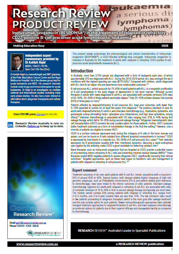 This review discusses inotuzumab ozogamicin indications and dosage, contraindications and a series of clinical studies featuring its use. It also provides commentary and recommendations from Dr Ashish Bajel, a haematologist and BMT physician at the Peter MacCallum Cancer Centre and the Royal Melbourne Hospital.
