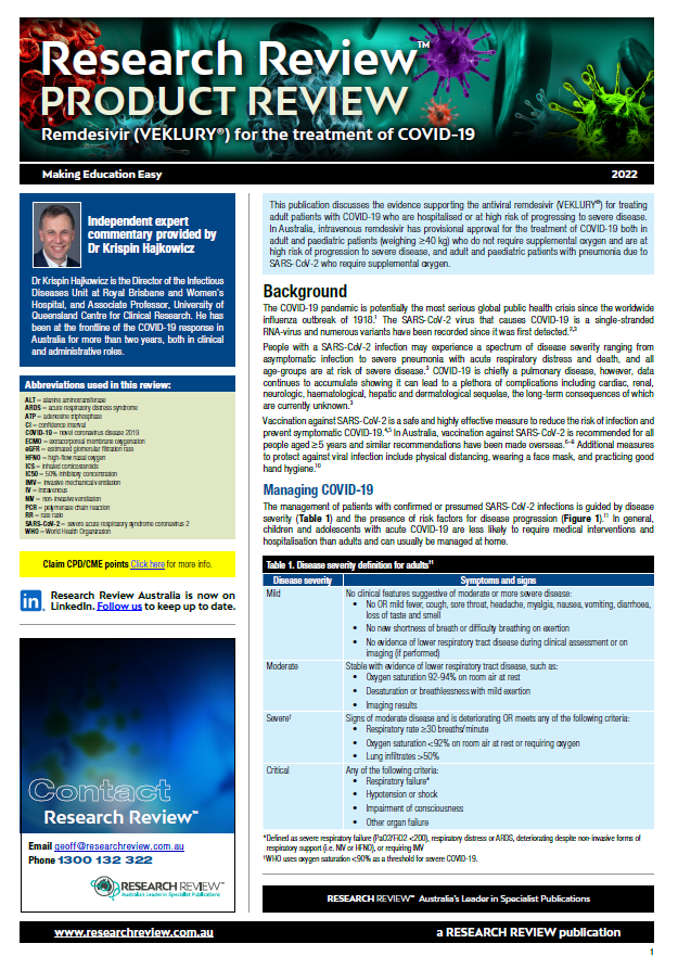 As part of our ongoing series focussing on new registrations in Australia, we have added a product review of Remdesivir for the treatment of COVID-19. This review discusses current management and risk classification of COVID-19, available medicines and indications and dosage of Remdesivir together with the major studies featuring Remdesivir.