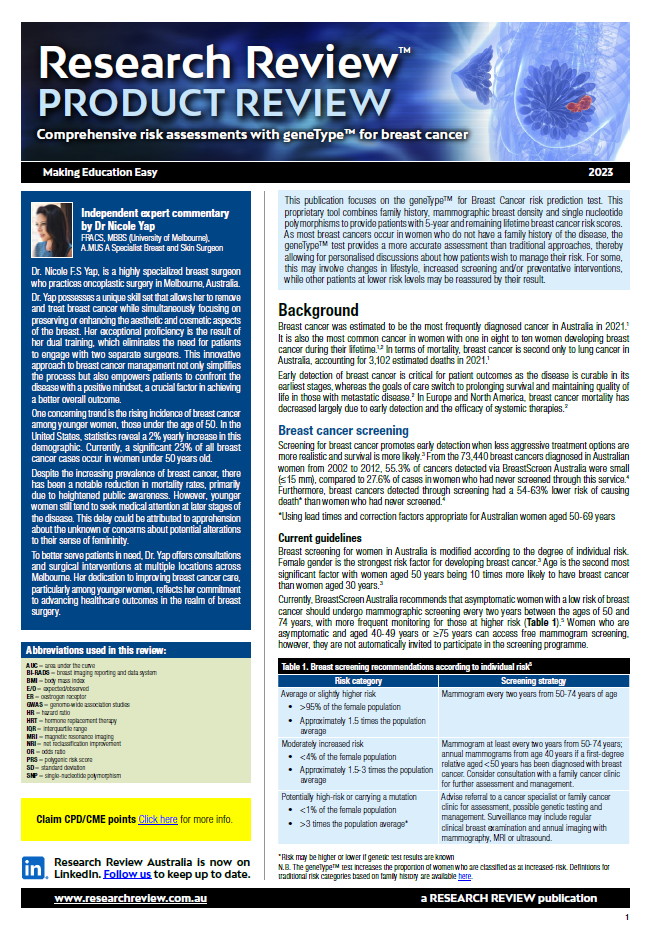 This publication discusses breast cancer screening and current guidelines, family history, clinical utility of polygenic risk, and a series of clinical studies looking at validation of geneType against additional models. It also provides commentary from Dr Nicole Yap, a breast surgeon who practices oncoplastic surgery in Melbourne.