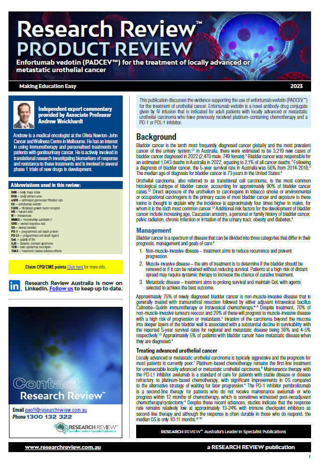 This publication discusses current management of urothelial cancer, indications and dosage of enfortumab vedotin, adverse effects and the evidence supporting its use. It also provides commentary from Associate Professor Andrew Weickhardt, medical oncologist at the Olivia Newton-John Cancer and Wellness Centre in Melbourne.