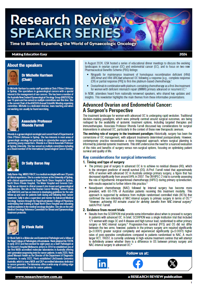 This is a summary of a dinner meeting discussing the evolving landscapes in ovarian cancer and endometrial cancer, and focussing on two new PBS listings for niraparib and dostarlimab. The speakers included Dr Michelle Harrison as Chair, Associate Professor Rhonda Farrell, Dr Sally Baron Hay and Dr Vivek Rathi.