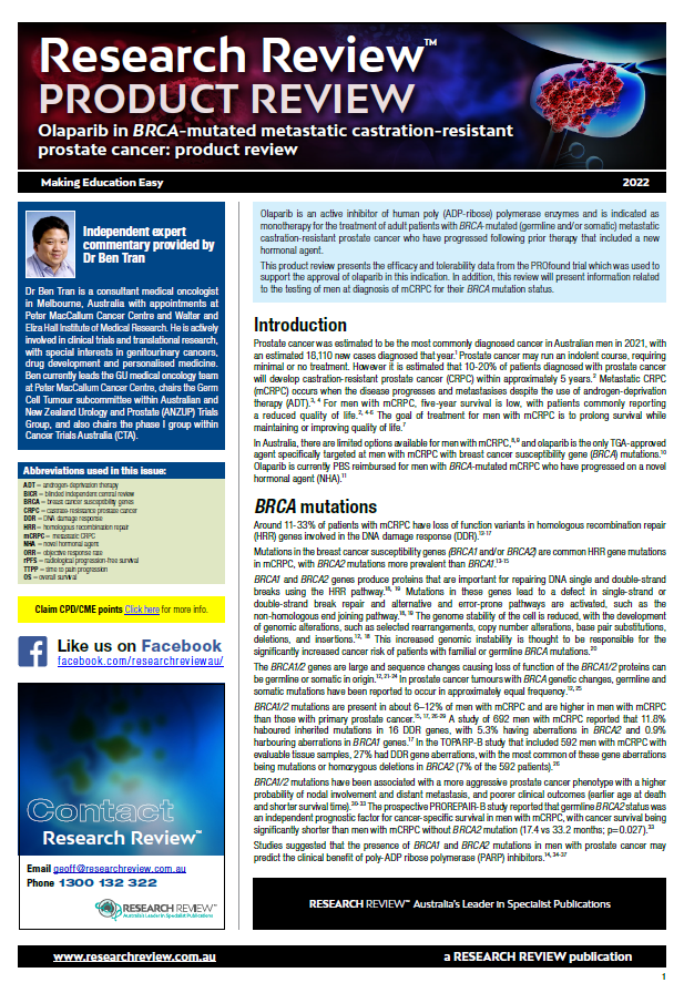 This review presents the efficacy and tolerability data from the PROfound trial and information related to the testing of men at diagnosis of mCRPC for their BRCA mutation status. Commentary has been provided by Dr Ben Tran, a consultant medical oncologist in Melbourne, with appointments at Peter MacCallum Cancer Centre and Walter and Eliza Hall Institute of Medical Research.