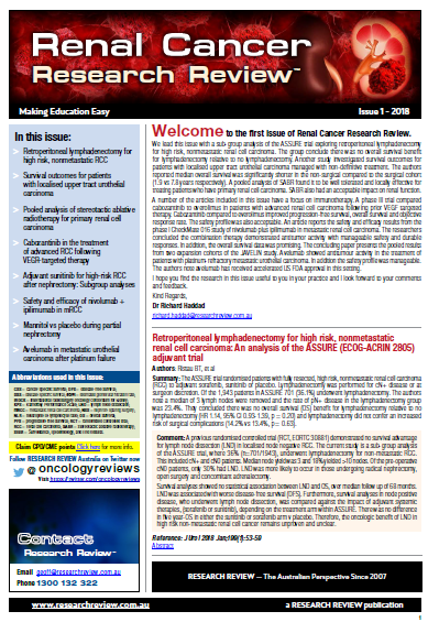 This review is a unique Australian publication with commentary from Associate Professors Craig Gedye and Alexander Guminski providing topical, relevant and accessible information for health professionals with an interest in renal cancer. The review is a summary of what we think are some of the most significant new papers in this area along with local commentary on why they are important and how the findings can potentially affect local practice. Links to the abstracts or fully published papers are also provided.