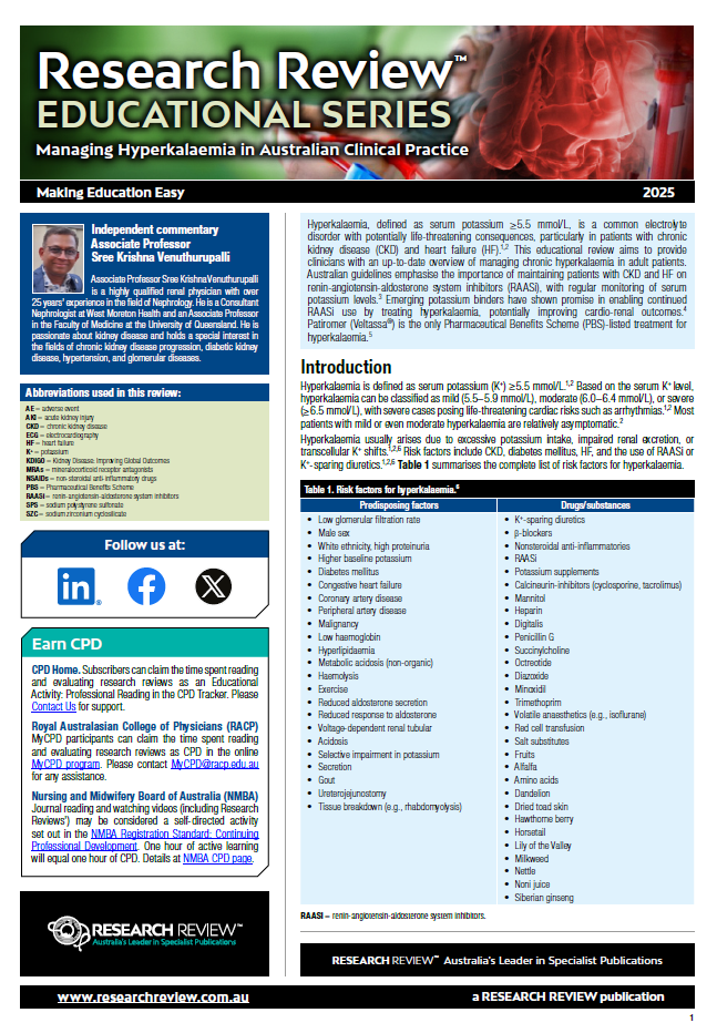 This educational review aims to provide clinicians with an up-to-date overview of managing chronic hyperkalaemia in adult patients. It also includes guiding commentary from Sree Krishna Venuthurupalli, a Consultant Nephrologist at West Moreton Health and an Associate Professor in the Faculty of Medicine at the University of Queensland.