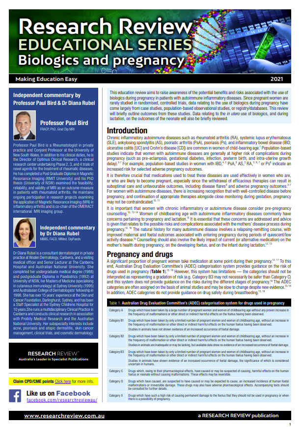 The review includes guiding commentary from Professor Paul Bird, a Rheumatologist in private practice and Conjoint Professor at the University of New South Wales, and Dr Diana Rubel, a consultant dermatologist in private practice at Woden Dermatology, Canberra.