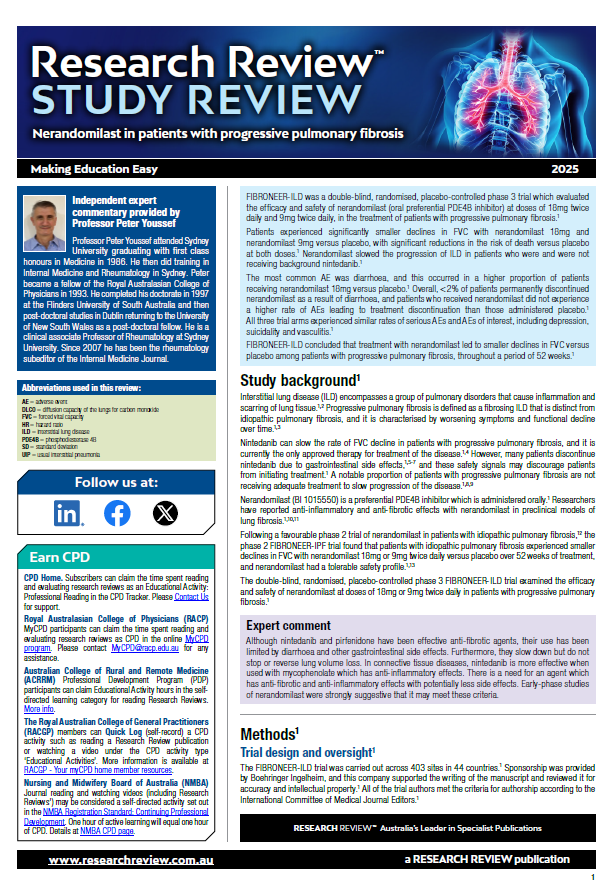 As part of our ongoing aim to bring you reports of new developments, we have added a review on FIBRONEER-ILD which was a double-blind, randomised, placebo-controlled phase 3 trial which evaluated the efficacy and safety of nerandomilast (oral preferential PDE4B inhibitor) at doses of 18mg twice daily and 9mg twice daily, in the treatment of patients with progressive pulmonary fibrosis.