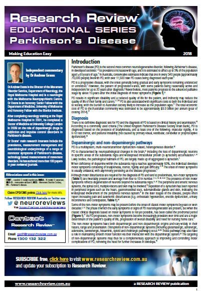 This educational review provides guidance on diagnosis, treatment of motor and non-motor symptoms, and guiding commentary from Dr Andrew Evans, Director of the Movement Disorder Service, Department of Neurology, the Royal Melbourne Hospital and neurologist with the Melbourne Neuropsychiatric Centre.