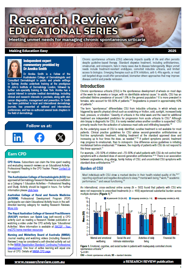 This educational series provides an overview of managing chronic spontaneous urticaria and the emerging therapies such as BTK inhibitors, anti-IL-4Rα agents, or mast cell-targeted drugs which could offer personalised, biomarker-driven approaches that may improve disease control and provide remission. It also includes guiding commentary from Dr Annika Smith, a Fellow of the Australasian College of Dermatologists and Consultant Dermatologist in public and private settings in Sydney.