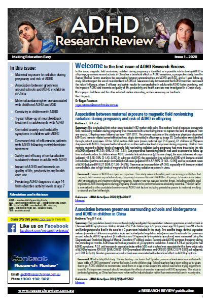 This Review features key medical articles from global psychiatry journals with commentary from Dr Terrance Lim. The Review covers topics such as anxiety and irritability in ADHD, impact of ADHD and insomnia on quality of life and productivity, risk factors, new medicines and neurofeedback treatment.