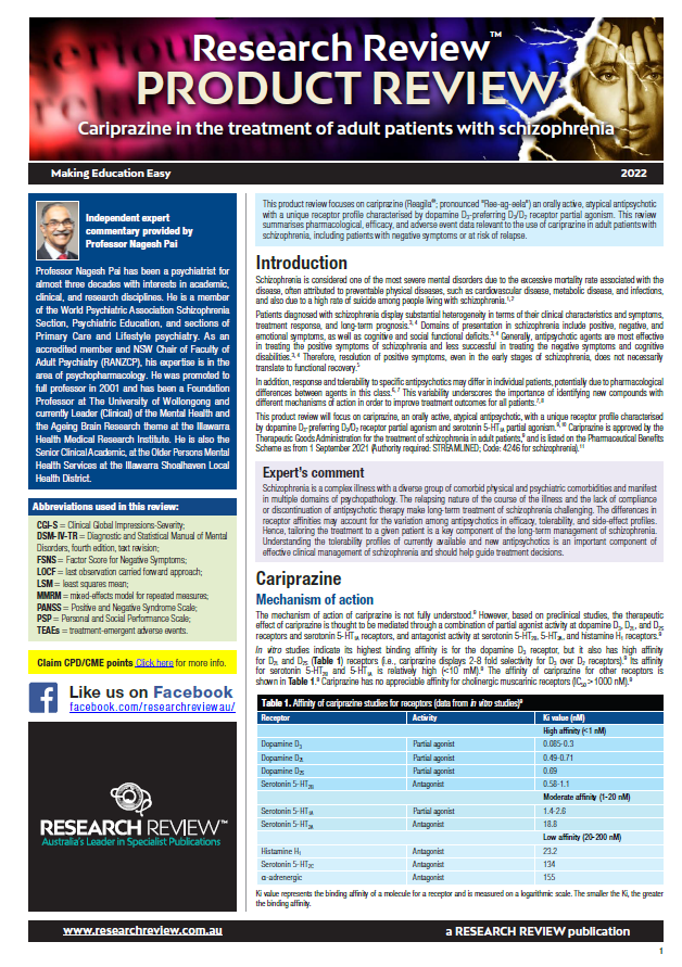 As part of our ongoing series focussing on new registrations in Australia, we have added a product review of the use of Cariprazine in the treatment of adult patients with schizophrenia. This review discusses the pharmacological properties, dosage and administration, prevention of schizophrenia relapse, and some key studies focussed on the use of Cariprazine.