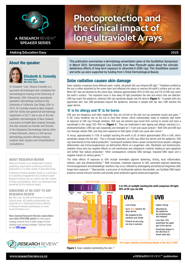 This publication summarises a dermatology presentation given at the Goodfellow Symposium in March 2025. Dermatologist Lisa Connelly from New Plymouth spoke about the clinically deleterious effects of long-term exposure to ultraviolet A (UVA) rays. This Goodfellow session and write-up were supported by funding from L’Oréal Dermatological Beauty.