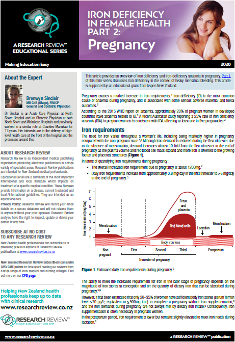 In this review: This article provides an overview of iron deficiency and iron-deficiency anaemia in pregnancy. This article is supported by an educational grant from Aspen New Zealand.
