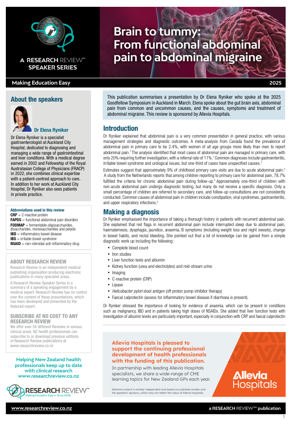 This publication summarises a presentation by Dr Elena Ryniker who spoke at the 2025 Goodfellow Symposium in Auckland in March. Elena spoke about the gut brain axis, abdominal pain from common and uncommon causes, and the causes, symptoms and treatment of abdominal migraine. This review is sponsored by Allevia Hospitals.