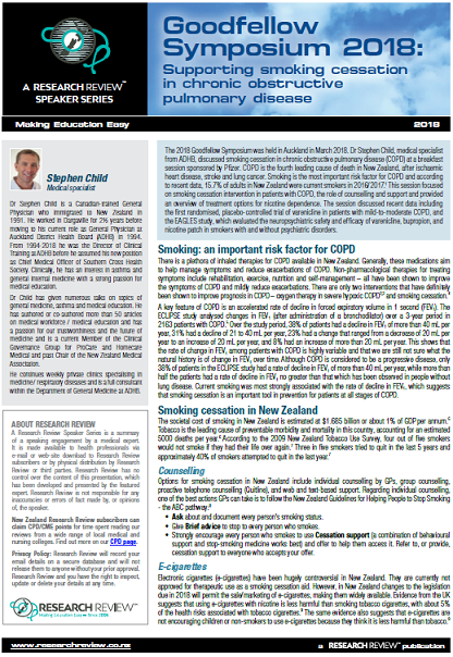 session sponsored by Pfizer. COPD is the fourth leading cause of death in New Zealand, after ischaemic heart disease, stroke and lung cancer. Smoking is the most important risk factor for COPD and according to recent data, 15.7% of adults in New Zealand were current smokers in 2016/2017.1 This session focused on smoking cessation intervention in patients with COPD, the role of counselling and support and provided an overview of treatment options for nicotine dependence. The session discussed recent data including the first randomised, placebo-controlled trial of varenicline in patients with mild-to-moderate COPD, and the EAGLES study, which evaluated the neuropsychiatric safety and efficacy of varenicline, bupropion, and nicotine patch in smokers with and without psychiatric disorders.