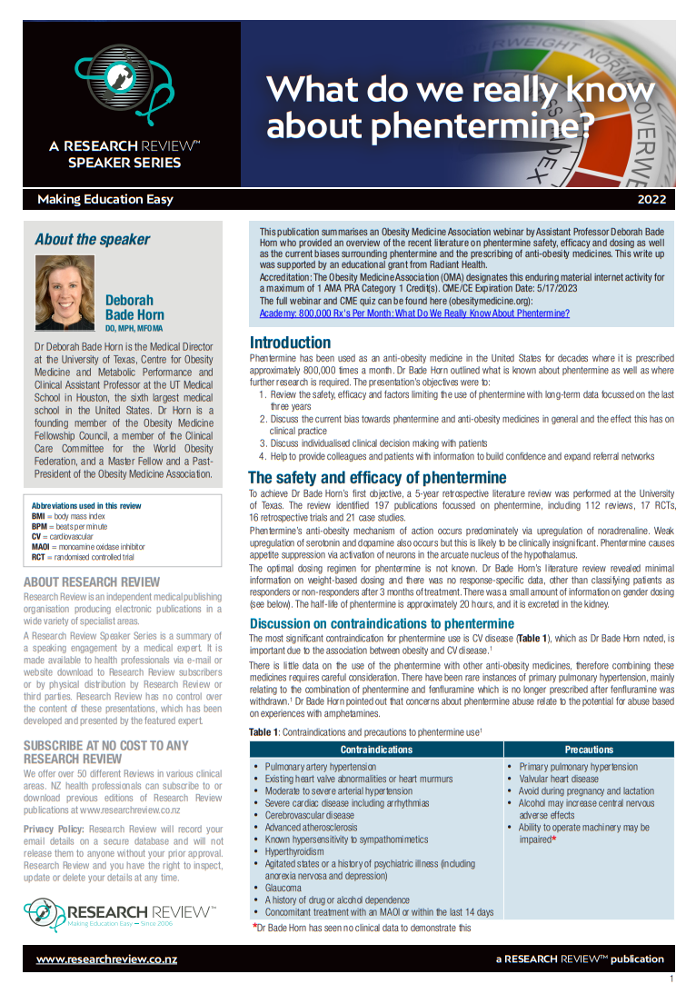 This publication summarises an Obesity Medicine Association webinar by Assistant Professor Deborah Bade Horn who provided an overview of the recent literature on phentermine safety, efficacy and dosing as well as the current biases surrounding phentermine and the prescribing of anti-obesity medicines. This write up was supported by an educational grant from Radiant Health. Accreditation: The Obesity Medicine Association (OMA) designates this enduring material internet activity for a maximum of 1 AMA PRA Category 1 Credit(s). CME/CE Expiration Date: 5/17/2023 The full webinar and CME quiz can be found here (obesitymedicine.org): Academy: 800,000 Rx's Per Month: What Do We Really Know About Phentermine?