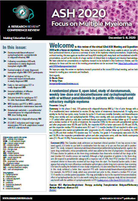 Welcome to this review of the virtual 62nd ASH Meeting and Exposition 2020 with a focus on myeloma. This review has been created to allow those unable to attend, but with a keen professional interest, to access a summary of some of the myeloma-related presentations. Despite being a virtual meeting, this was again an excellent and busy ASH meeting with many basic and translational scientific presentations, as well as the results of a huge number of clinical trials in malignant and classical haematology. We have selected ten presentations on myeloma research to be included in this Conference Review.