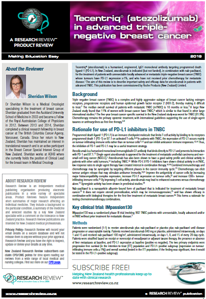 Tecentriq® (atezolizumab) is a humanised, engineered, IgG1 monoclonal antibody targeting programmed death ligand-1 (PD-L1). In New Zealand, atezolizumab is indicated (but not funded), in combination with nab-paclitaxel, for the treatment of patients with unresectable locally advanced or metastatic triple-negative breast cancer (TNBC) whose tumours have PD-L1 expression ≥1%, and who have not received prior chemotherapy for metastatic disease.1 The aim of this review is to describe important safety and efficacy data for atezolizumab in patients with advanced TNBC. This publication has been commissioned by Roche Products (New Zealand) Limited.