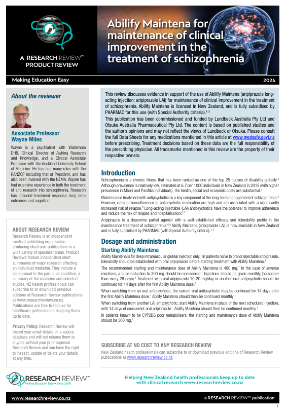 This publication has been commissioned and funded by Lundbeck Australia Pty Ltd and Otsuka Australia Pharmaceutical Pty Ltd. The content is based on published studies and the author’s opinions and may not reflect the views of Lundbeck or Otsuka. Please consult the full Data Sheets for any medications mentioned in this article at www.medsafe.govt.nz before prescribing. Treatment decisions based on these data are the full responsibility of the prescribing physician. All trademarks mentioned in this review are the property of their respective owners.
